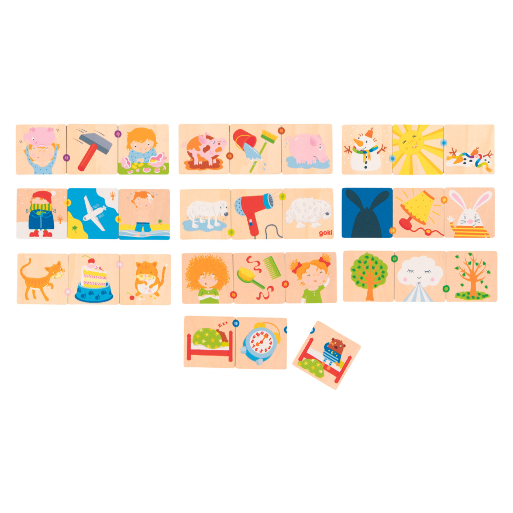 Wat gebeurt er als de sneeuwpop te lang in de zon staat? Dan smelt hij weg. 30 educatieve houten kaarten helpen je kind om goed volgoorde te vinden en zinnen te maken.